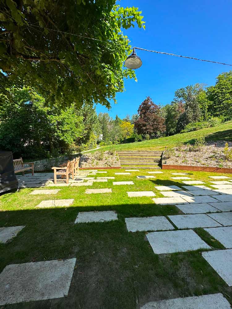 Chaque espace de cette création paysagère est à la fois unique et relié aux autres. Les seuils en pavés créent le lien entre l’habitation et la grandeur de l’espace arboré.
