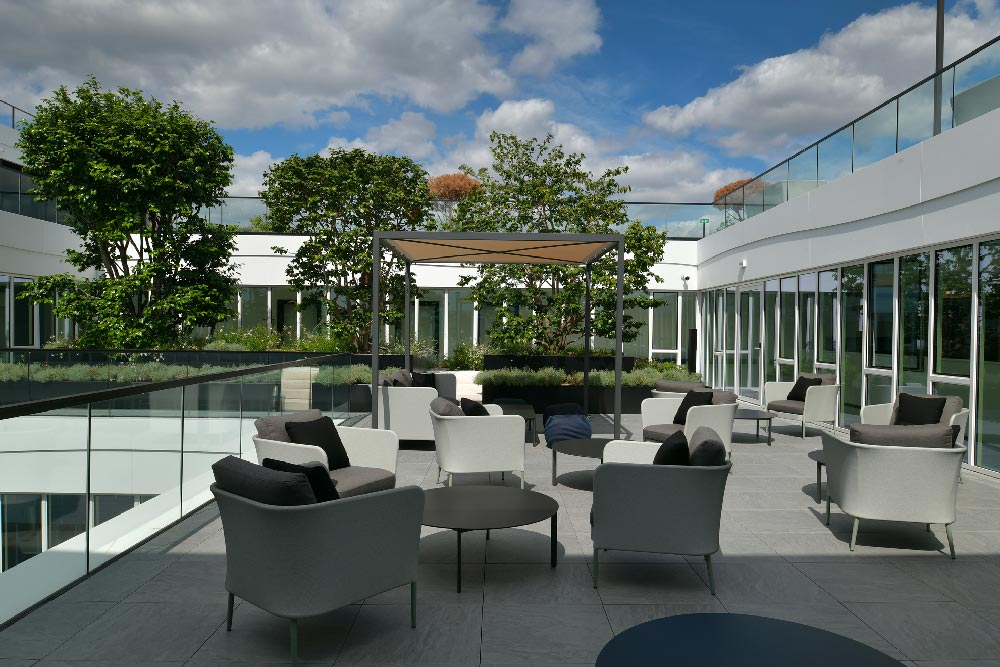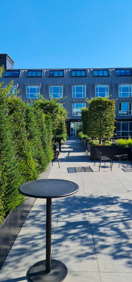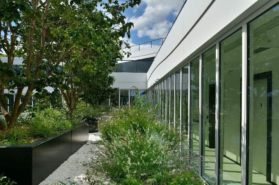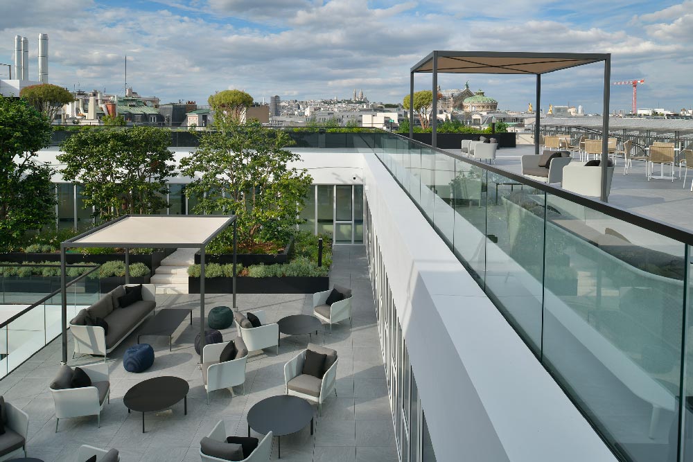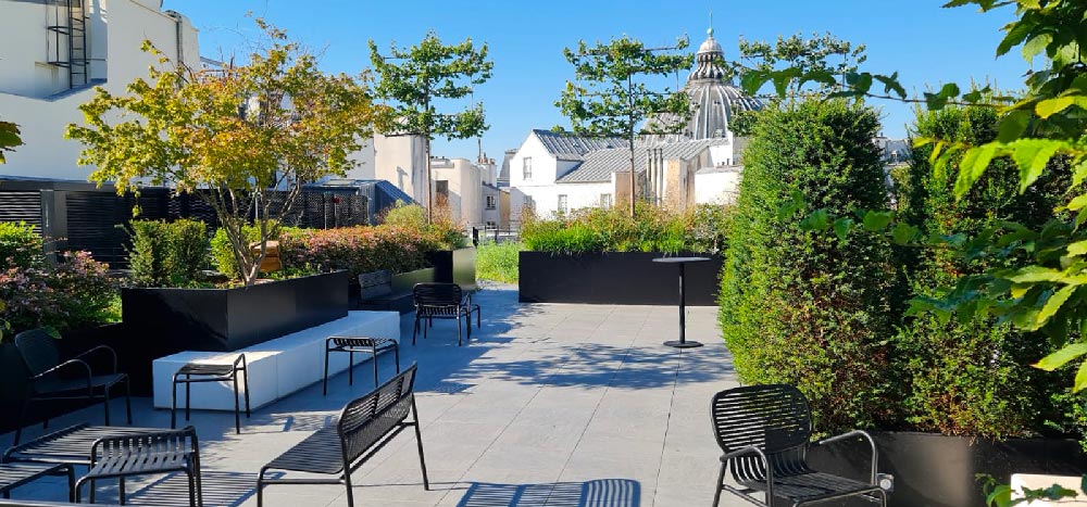 Dans la célèbre rue Cambon du 1er arrondissement de Paris, cette ancienne institution bancaire fait peau neuve en 2021 et devient le siège social d’une maison de haute couture. Le projet se doit en adéquation avec les valeurs et les codes de la marque. Le lieu se veut alors être à la fois emblématique et intime. Les différents espaces extérieurs : patios, terrasses, rooftop, cours constituent un élément prépondérant au projet quant à son intégration avec le paysage urbain. Ce projet de grande envergure offre différentes ambiances en fonction des espaces qui sont traités à la fois sur le plan horizontal que vertical et sont support de développement de biodiversité. Les camélias blancs, symboles forts de la marque, règnent sur les diverses terrasses.
