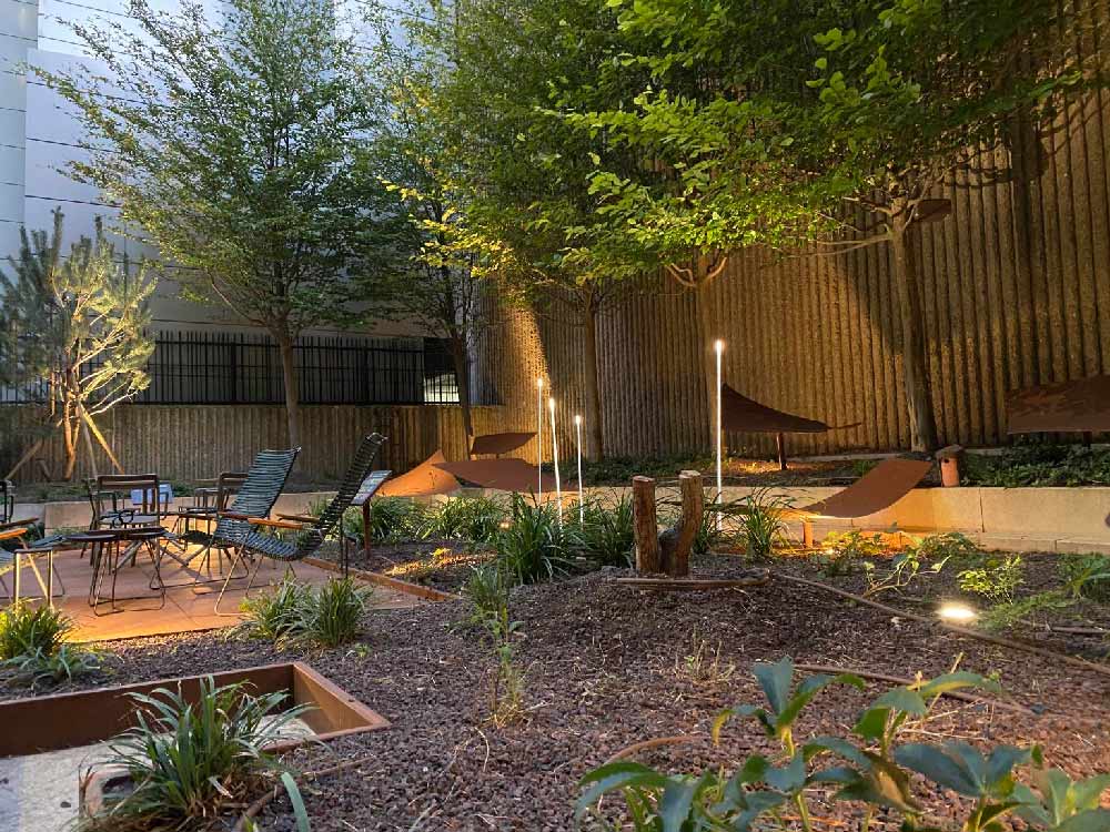 Un écrin de verdure généreux et unique au pied de la tour CB21 à la Défense ! Cette réalisation c’est 1500 m2 de jardins et terrasses dans un cadre urbain dynamique et effervescent. Les diverses palettes végétales viennent créer une ambiance vivante, structurante et intimiste à ciel ouvert. Les allées bordées et soulignées par la plantation d’arbustes, d’arbres, de vivaces et de graminées créent un cheminement, subtilement éclairé où chaque sujet est mis en valeur. La fourniture et l’installation d’un « bureau fertile » en métal thermolaqué sur mesure permet un cadre de travail au plus près du vivant. La biodiversité est préservée avec l’installation de nichoirs suspendus et sur pieds pour mésanges et moineaux. L’ensemble du jardin est équipé d’un réseau d’arrosage automatique goutte à goutte.