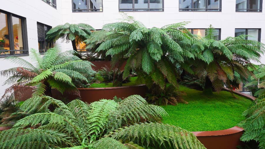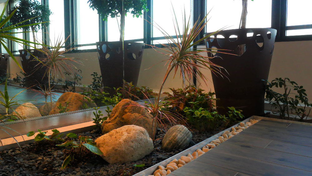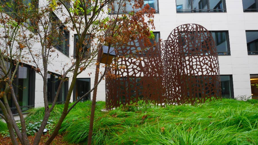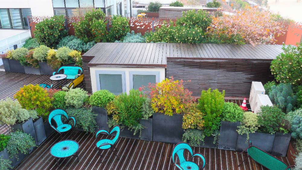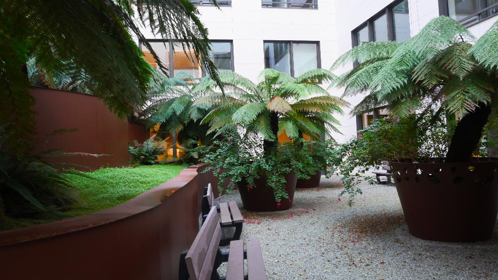 Situé face à la Seine à Levallois-Perret, ce site a été investi par le célèbre groupe L’Oréal dans le cadre de la restructuration des divisions sélectives. Les mots clés de ce projet sont « calme » et « volupté ». L’idée a été évidemment de penser le projet d’aménagement extérieur en lien avec l’intérieur. On retrouve alors une palette colorée aux notes douces, sages et relaxantes ; principalement du vert, des touches plus froides avec du bleu et des touches dynamiques de jaune. Au total c’est 700m2 de terrasses dont bénéficient les salariés du groupe. On retrouve également des patios intérieurs qui jouent avec les courbes, les reliefs et les formes libres. Un travail graphique rendu possible grâce à la réalisation de voliges et de jardinières en acier Corten, la plantation d’arbres, d’arbustes et de vivaces.