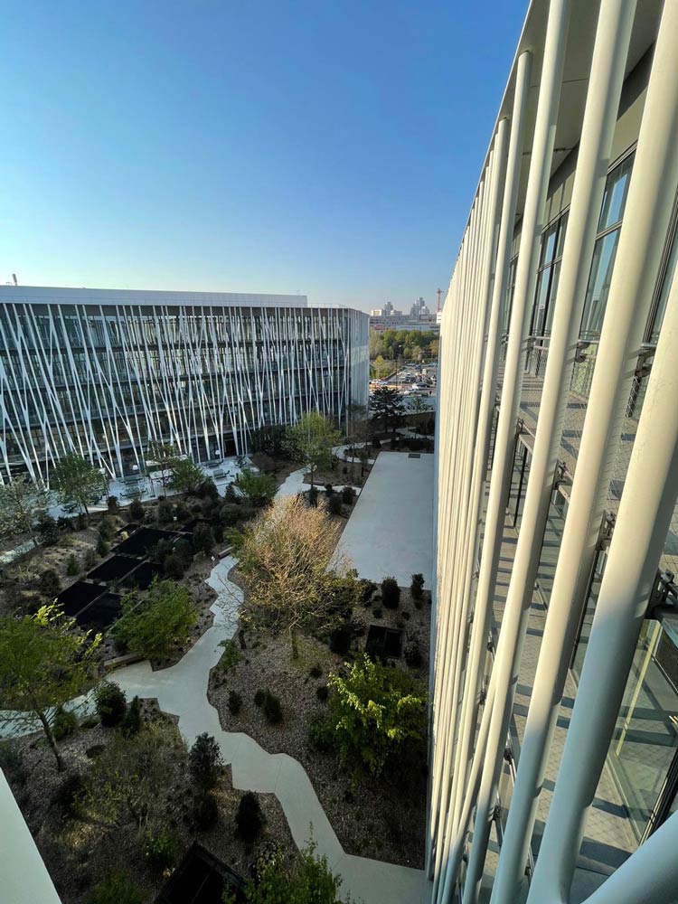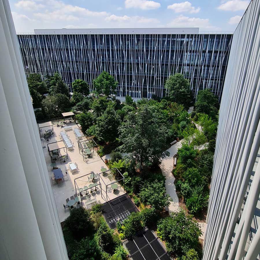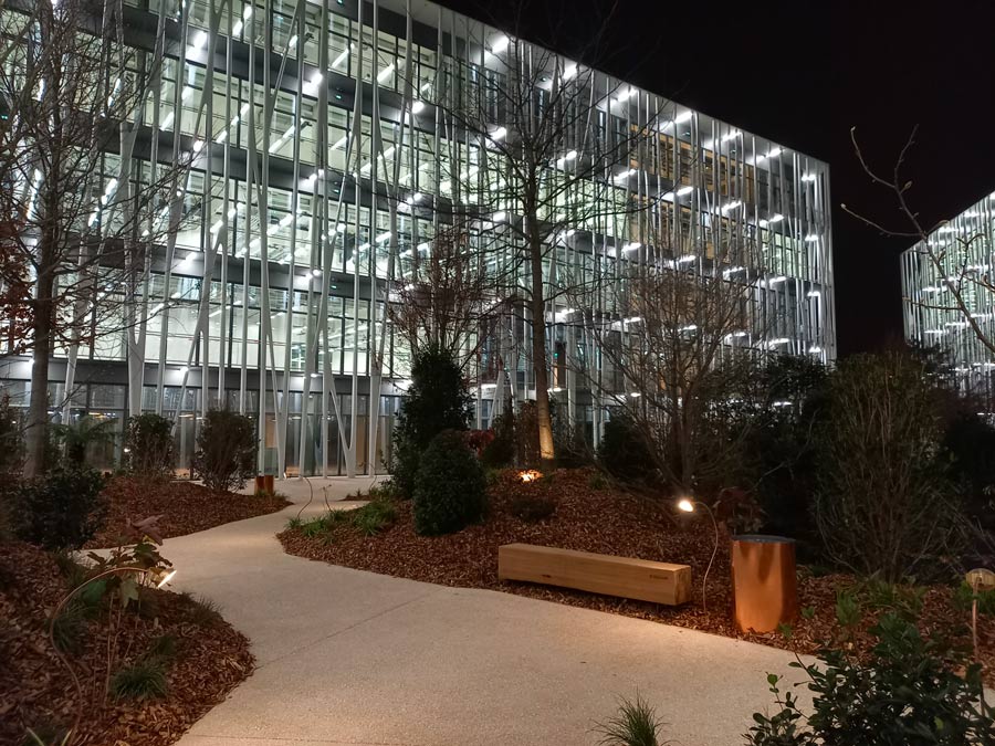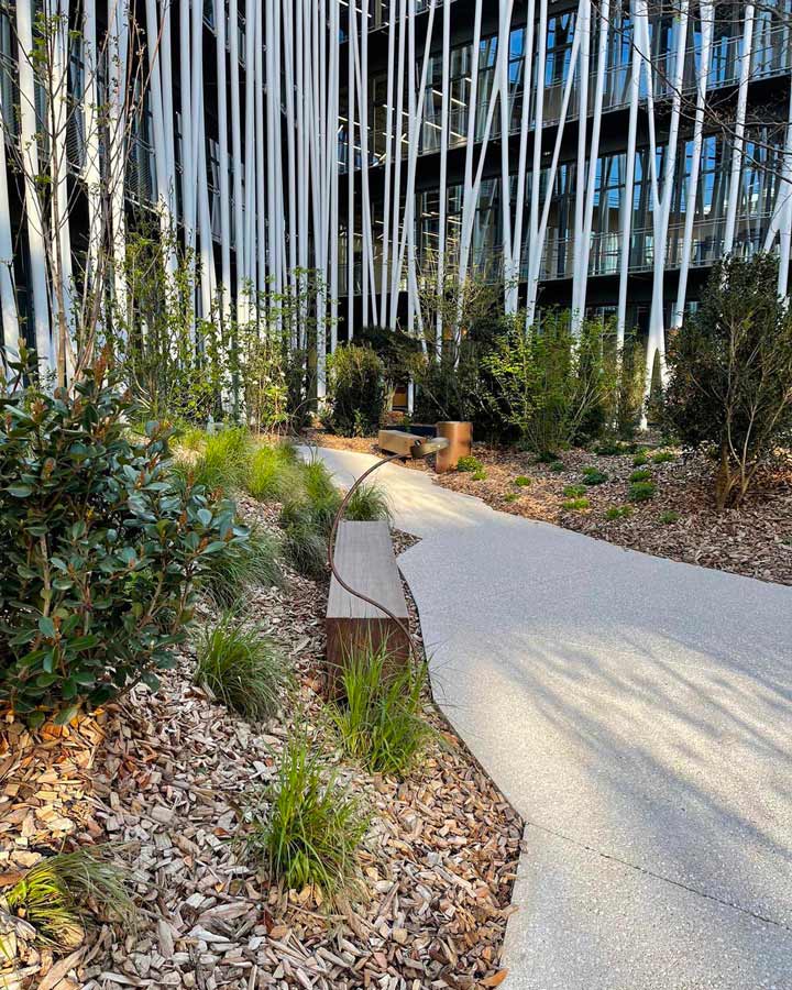 C’est aux portes de Paris, à Aubervilliers que le bâtiment du 19M, pensé et construit par le célèbre architecte Rudy Riciotti est inauguré en 2020. Vue en plan, la forme triangulaire du site abrite en son centre un jardin qui fait le lien avec la ville et le bâtiment, jouant sur les limites du dedans, dehors avec les façades entièrement vitrées. Le jardin se dévoile au gré des points de vue depuis l’intérieur. Le projet s’inscrit dans cette idée de lien, de tissage entre l’intérieur et l’extérieur, véritable cheminement. Il renvoie par le choix des végétaux (camélias, fagus, conifères etc.) et le paillage au sol à une forêt naturelle. L’éclairage est un point clé du projet. Il accentue la hauteur du bâtiment, des végétaux et souligne la courbe au sol, tout en venant révéler certains détails comme les bacs cuivrés, les bancs en chêne. Le tout dans une esthétique cohérente.
